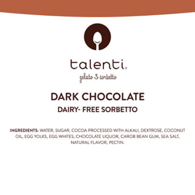 Up to 5 cash back Talenti Dairy-Free Sorbetto in Dark Chocolate is a decadent dairy-free dark chocolate sorbetto frozen dessert crafted with rich cocoa and a dairy-free chocolate.